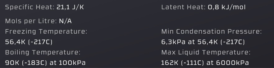 Condensation: Condense a single type of gas into liquid from a gas mix when the temperature is below one of the gases "Max liquid temperature" and the pressure is above its "Vapor pressure" (performed in the Condensation Chamber or inside pipes/tanks).