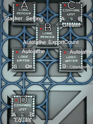 This circuit works by keeping the autolathe on while it's current ExportCount is less than the setting on the Stacker that you have attached. Once the ExportCount reaches the stacker setting, the autolathe's memory is reset(setting ExportCount to 0) and the Autolathe is powered off for one tick and then powered back on.